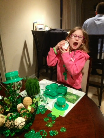 The girls woke up to find a trail of shamrocks leading to a bucket full of green dress up, green silly string, green glow bracelets, four leaf clovers, shamrock stickers, green bubbles and green mustaches. Then they came downstairs to a green breakfast; shamrock shaped scones with green glaze, kiwi/strawberry smoothies and green grapes. I packed them a green lunch with rainbow goldfish, shamrock shaped sandwiches, green grapes and lucky charm rice crispie treats. They were completely pinch-proof dressed in green at school today. When I picked them up they had shamrock shakes (just a little and froze the rest) and mint Oreos. After homework they had a green silly string fight in the back yard followed by lime Popsicles and shamrock art projects. Dinner consisted if green milk, Mac n cheese, green apple sauce, edemame and green grapes. They had mint chocolate chip Klondike bars and green cupcakes for dessert. St. Patty's is one of my favorite holidays. The girls sure seemed to enjoy it, too.